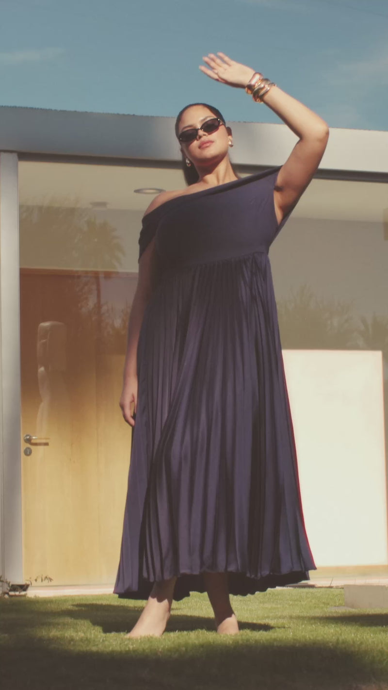• Off the shoulder pleated midi dress